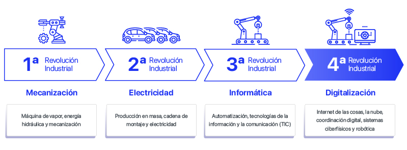 La cuarta y actual revolución industrial, también llamada industria 4.0 supone cambios estructurales a nivel organizativo, productivo y de gestión de clientes con el fin de conseguir fábricas más eficientes y productivas conectadas entre sí mediante sistemas autónomos. Además, ya es posible la generación y análisis de datos sin necesidad de involucrar a las personas, mediante el uso de plataformas de gestión y control centralizadas.